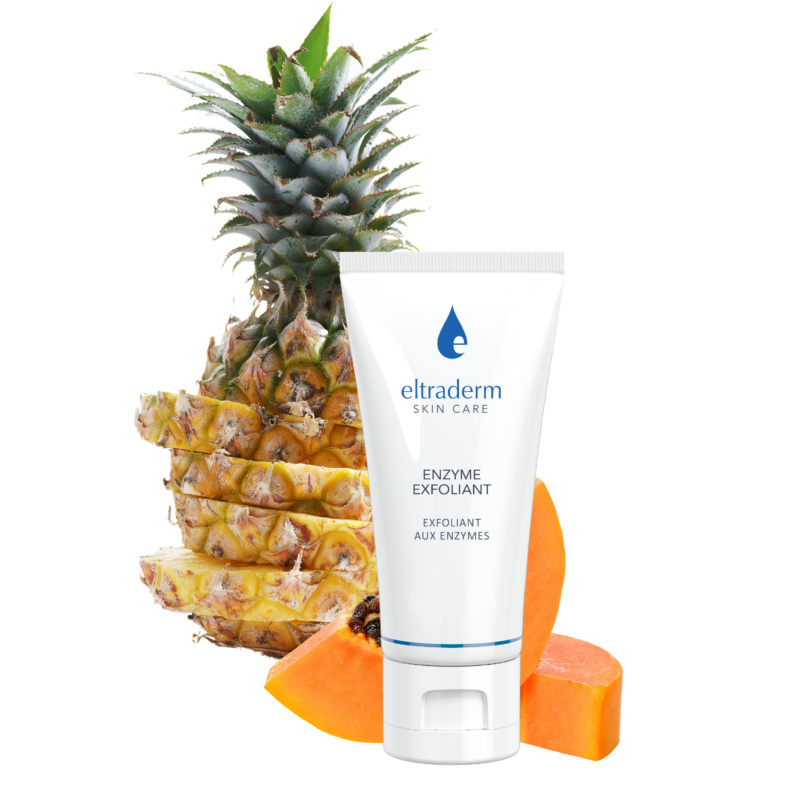 - Our Enzyme Exfoliant blends natural fruit enzymes, papain (papaya) and bromelain (pineapple), to deliver a soft, yet effective enzymatic exfoliation, ideal even for the most sensitive skin conditions.This gentle exfoliant dissolves dead skin cells on the surface of the skin to reveal more radiant skin. The enzymatic action of these key proteolytic enzymes accelerate the skin’s natural exfoliation process by gently digesting the keratinized protein layer around aged or damaged skin cells. Essentially, the breakdown of accumulated dead or damaged skin cells helps to stimulate the production of healthy fresh skin cells.
